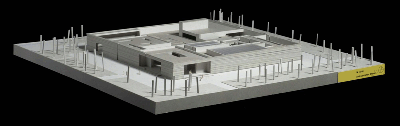 versehenen Volumens. Das sehr komplexe Raumprogramm wird in einer